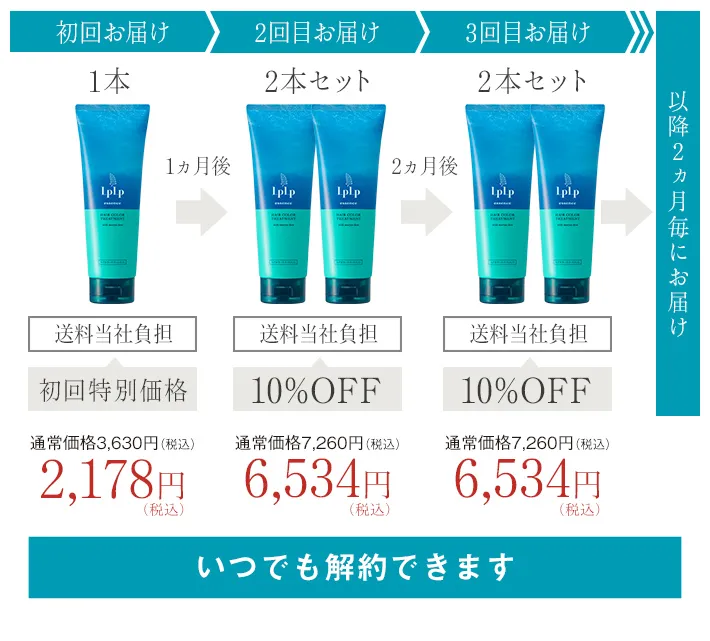 ![初回は1本、2回目以降は1ヵ月ごとに1本お届けします。 [初回のお届け内容] お申込みから5日前後で、LPLP essenceカラートリートメント1本を、キャンペーン特別価格の1,980円(税込2,178円)でお届けいたします。 [2回目のお届け内容] 初回お届け予定日から1ヵ月後に、LPLP essenceカラートリートメント1本を、『定期便割引5%OFF』の3,135円(税込3,448円)でお届けいたします。 ※他社でよくある「最低◯回定期便サービスを利用しないといけない」などの条件は一切ありません。いつでも解約できますので、安心してご利用ください。 ※次回お届け予定日は「納品明細書兼領収書」でご確認いただけます。 ※キャンセルのお手続きをいただくまで定期的に商品をお届けいたします。 ※各種変更(お届け商品・お届け日時・お届けサイクルなど)はWEBマイページからも可能です。 ※代引きの場合、購入代金は商品のお届け時にお支払いください。また、クレジットカードでのお支払いの場合は、ご契約のクレジットカード会社により支払日が異なりますので、各クレジットカード会社の会員規約をご確認ください。 ※ご注文後のキャンセルや注文内容の変更、解約については、お手数ですが、ルプルプ サービスセンター(0120-6262-14)までご連絡ください。 ※返送にかかる送料は、お客様のご負担となります。](https://d2w53g1q050m78.cloudfront.net/wwwstellasensejp/uploads/lplp/sp/ad/lpnw/lp01/110D/img/text_canpaign.webp)