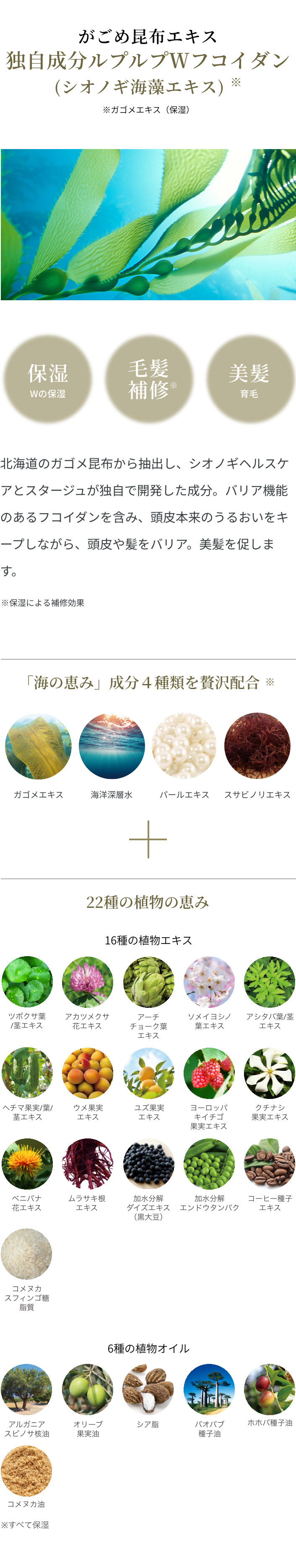 水、ラウロイルメチルアラニンNa、コカミドプロピルベタイン、コカミドメチルMEA、加水分解水添デンプン、ヤシ油脂肪酸PEG-7グリセリル、コイルメチルタウリンNa、グリセリン、ベタイン、レブリン酸、フィトステロールズ、セラミドNG、セラミドAP、アルガニアスピノサ核油、オリーブ果実油、シア脂、バオバブ種子油、ホホバ種子油、コメヌカ油、イソステアロイル加水分解コラーゲンAMPD、メドウフォーム-δ-ラクトン、ガゴメエキス、スサビノリエキス、ツバキ葉/茎エキス、アカツメクサ花エキス、アーチチョーク葉エキス、メリッサ葉エキス、アンソクコウノキ樹皮エキス、ヘチマ果実/葉/茎エキス、カンゾウ根エキス、ヨーロッパキイチゴ果実エキス、クチナシ果実エキス、シャクヤク根エキス、ムラサキ根エキス、加水分解コンキオリンタンパク、加水分解シルク、加水分解エンドウタンパク、コーヒー種子エキス、コメヌカスフィンゴ糖脂質、乳酸Na、海水、リンゴ酸ジイソステアリル、ココイル加水分解コラーゲンK、ポリクオタニウム-50、ポリクオタニウム-10、ポリクオタニウム-7、トコフェロール、デキストラン、カプリリルグリコール、ペンチレングリコール、BG、ラウリン酸BG、PPG-9ジグリセリル、ココイルグリシンK、ココイルアラニンTEA、ココアンホ酢酸Na、ラウレス-4カルボン酸Na、オクチルドデシルPG-16ソルビタン、グリコール酸、エチルヘキシルグリセリン、DPG、塩化Na、EDTA-2Na、フェノキシエタノール、安息香酸Na、香料